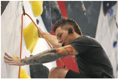 Visually impaired rock climbers rely on a guide to tell them information about the route while they are climbing it.